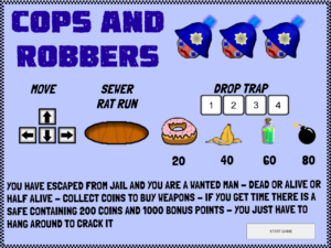 Cops and Robbers SECURITY ALERT! – CRIMINAL ESCAPES FROM JAIL You start with some bonus coins which you can use to foil the fuzz. keys 1-4 select either 1. Doughnut 2. Banana Skin 3. Stink Bomb 4. Real Bomb You get more coins from the streets ◀ Tail Gunner The Temple of Zog ▶