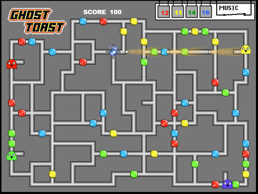 Ghost Toast Get as many consecutive colors to boost the bonus This is reset when you switch colors Dodge the Bullets Avoid the Ghosts ◀ Zapp Wrap Box-Bot ▶
