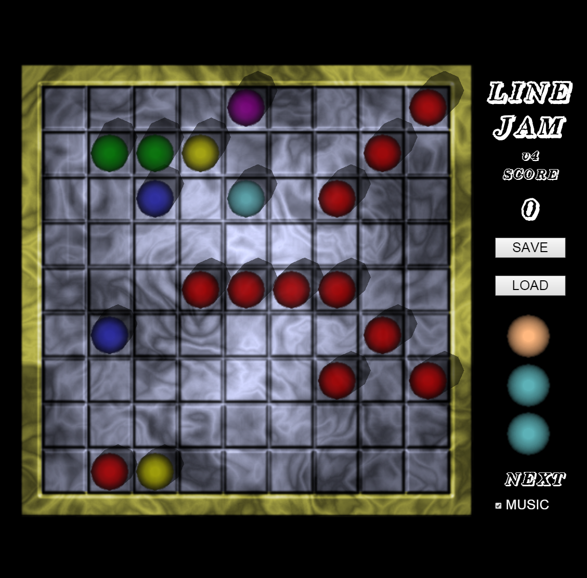 Line Jam Line upĀ FIVE stones of the same colour. Select a Stone then a Destination. Horizontal, Vertical or Diagonal. Save or Load a game at anytime. Dashboard displays score and Next Stones to Fall ◀ Colour Crunch Spells and Spiders ▶