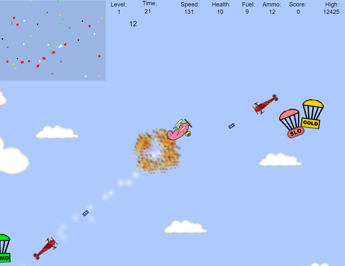 You start with low fuel, low ammo and low health with strange aircraft shooting at you, but there is radar to locate supplies. The GOLD parachutes are not on the RADAR. They will upgrade your capacity levels